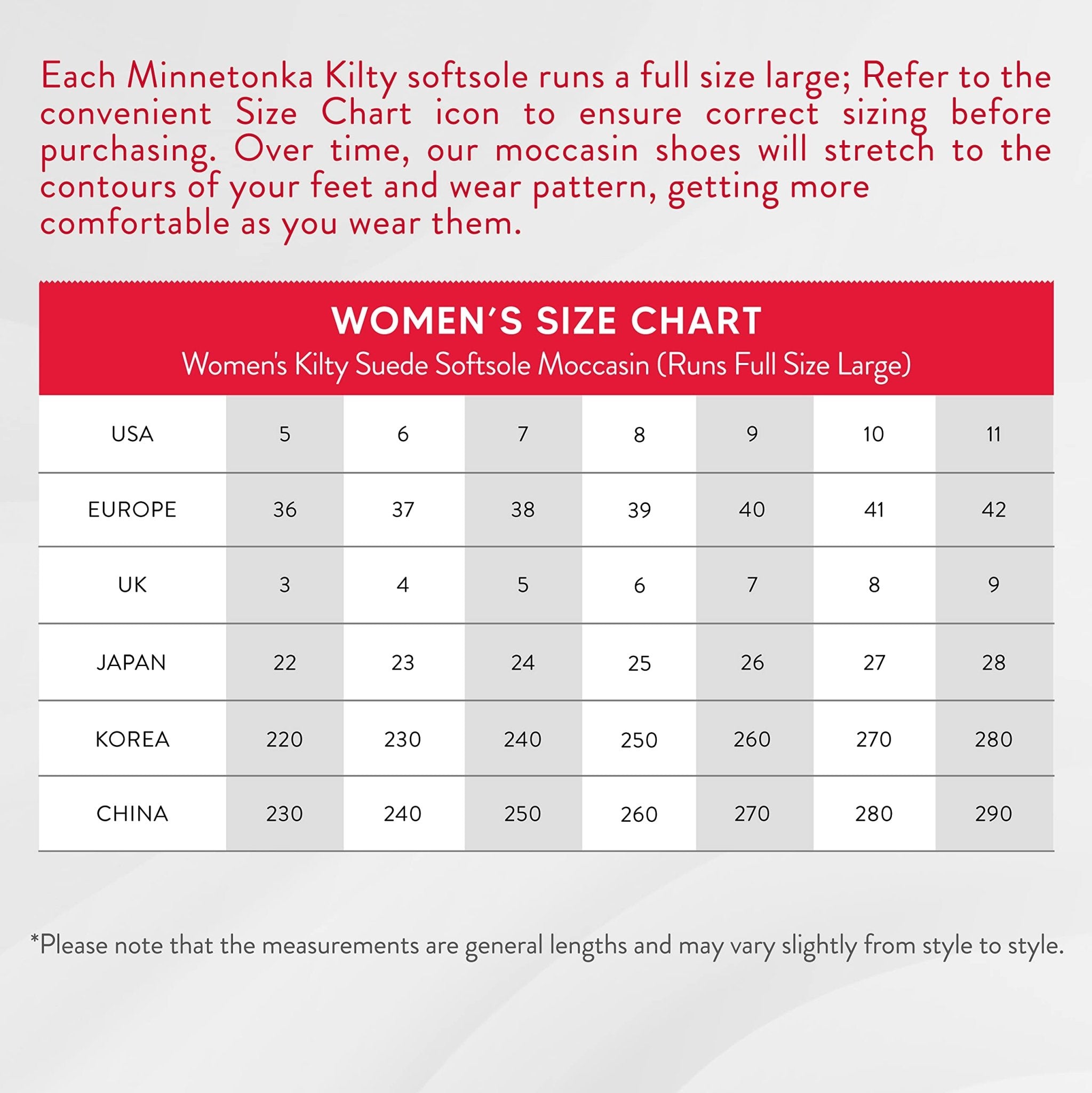 CONVENIENT SIZING: Each Minnetonka Kilty softsole run full size large; Refer to the convenient Size Chart icon to ensure correct sizing before purchasing; If your feet are different sizes, make sure to measure the larger one for the best fit